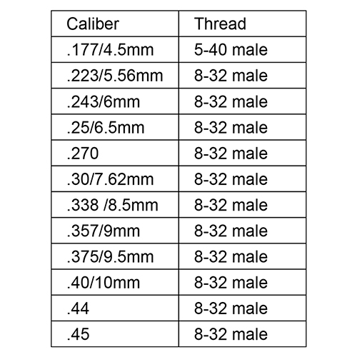 .177, .22, 6 mm, .25, .27, .30, .338, .35, .357, .40, .44, .45, .50 kal.