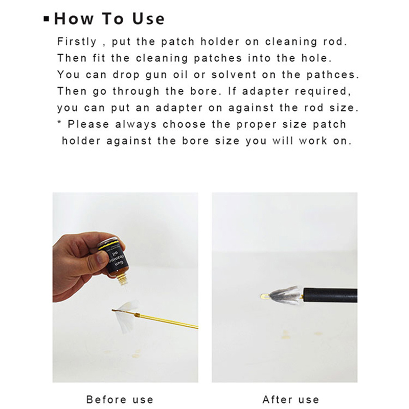 Držala za obliže za čiščenje orožja in adapterji 6 Pack, 6 Pack držala za obliži za čiščenje orožja/konice z režami in adapterji za povezovanje palic, zapakirani v en mini kovček, je univerzalni komplet za čiščenje orožja za puške šibrenice, ki ustrezajo vsem kalibrom. Dva adapterja vam omogočata, da ju povežete na čistilne palice v različnih vijačnih maticah. Postavite čistilne obliže skozi luknjo z režami in kapljajte topilo ali olje za pištolo, da očistite izvrtine.