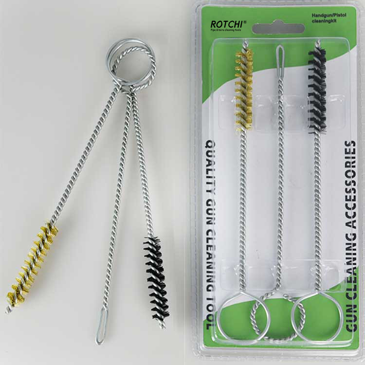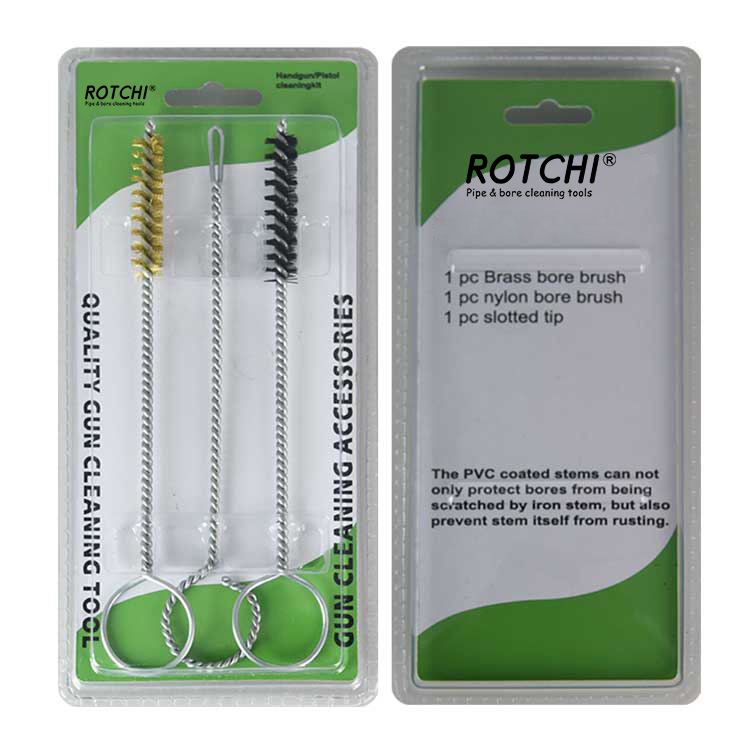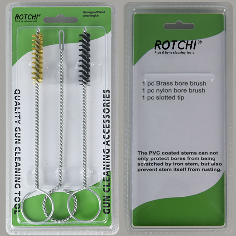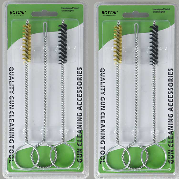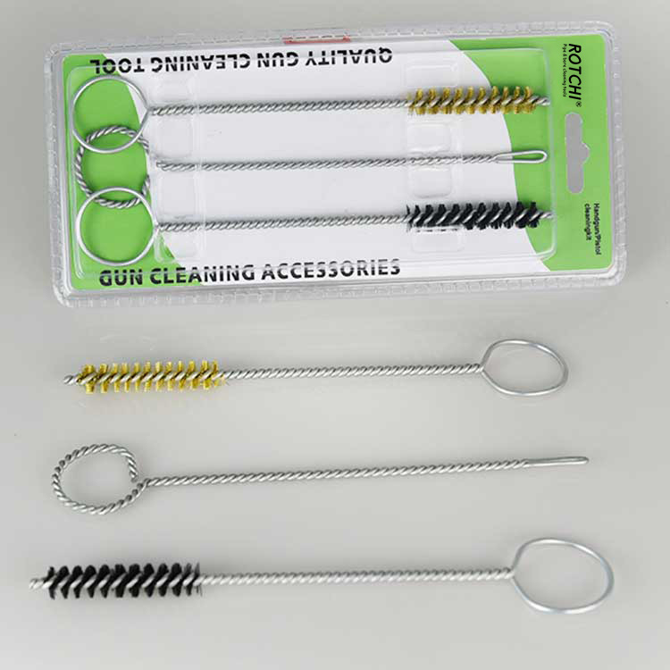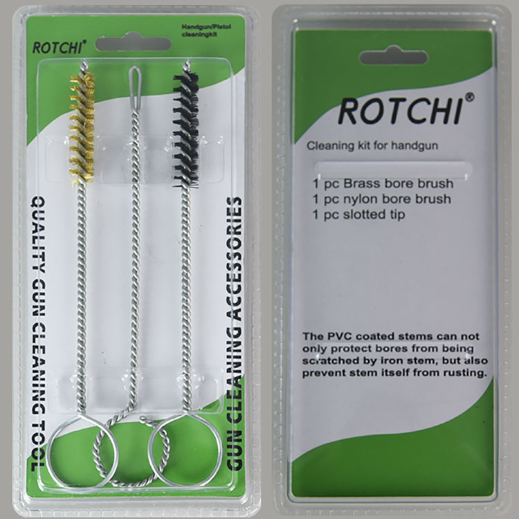 3 kosi kompleta za čiščenje pištole, pakiran v dvojnem pretisnem omotu. Ena medeninasta ščetka za čiščenje izvrtin, ena najlonska ščetka za čiščenje izvrtin in eno držalo za obliž z režami. Priročno in učinkovito.