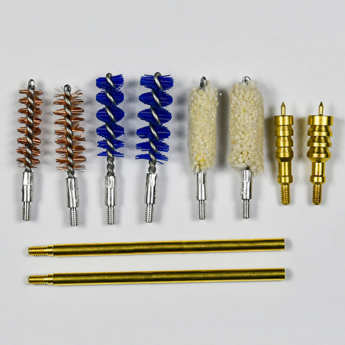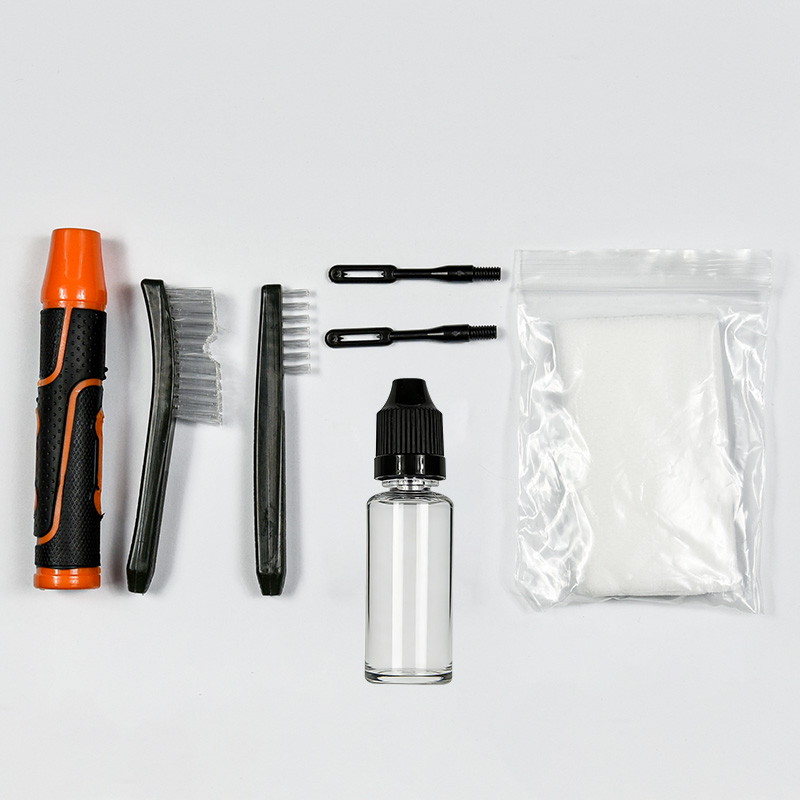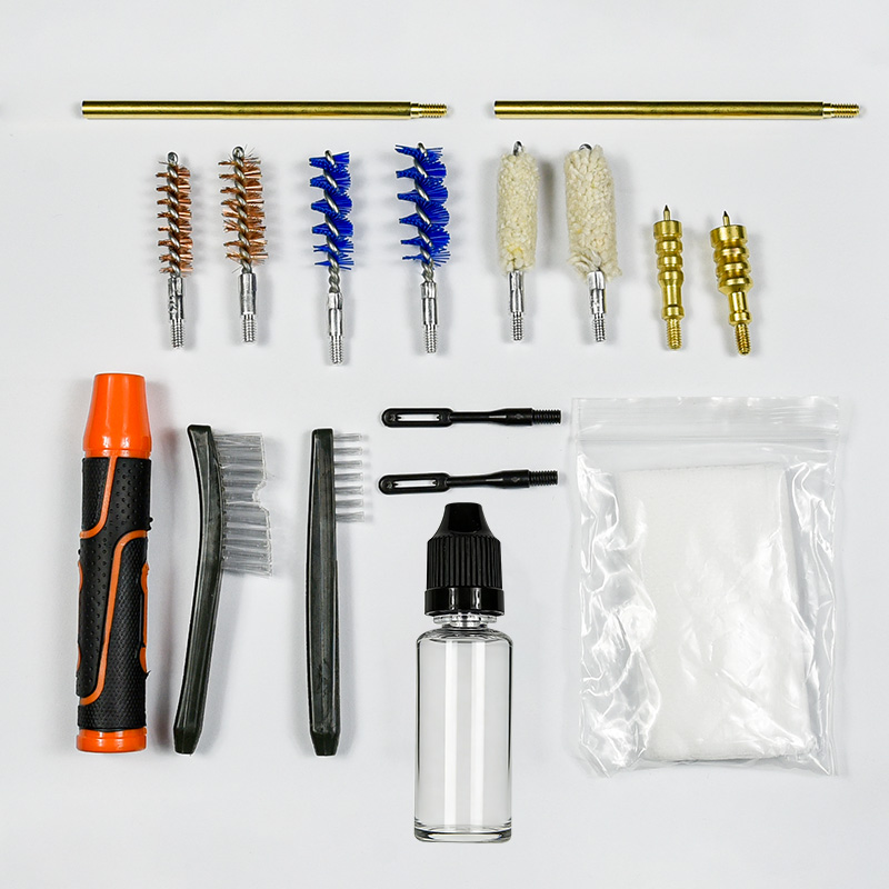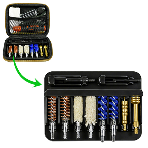Komplet za čiščenje pištole vključuje 2 velikosti (9 mm in .45 kal.). Prevlečeno s tkanino OX PVC etui z zadrgo. Medeninaste ščetke, bombažne krpe, najlonske ščetke, medeninaste ščetke, 2 palici. Pesek in črna barva za izbiro.