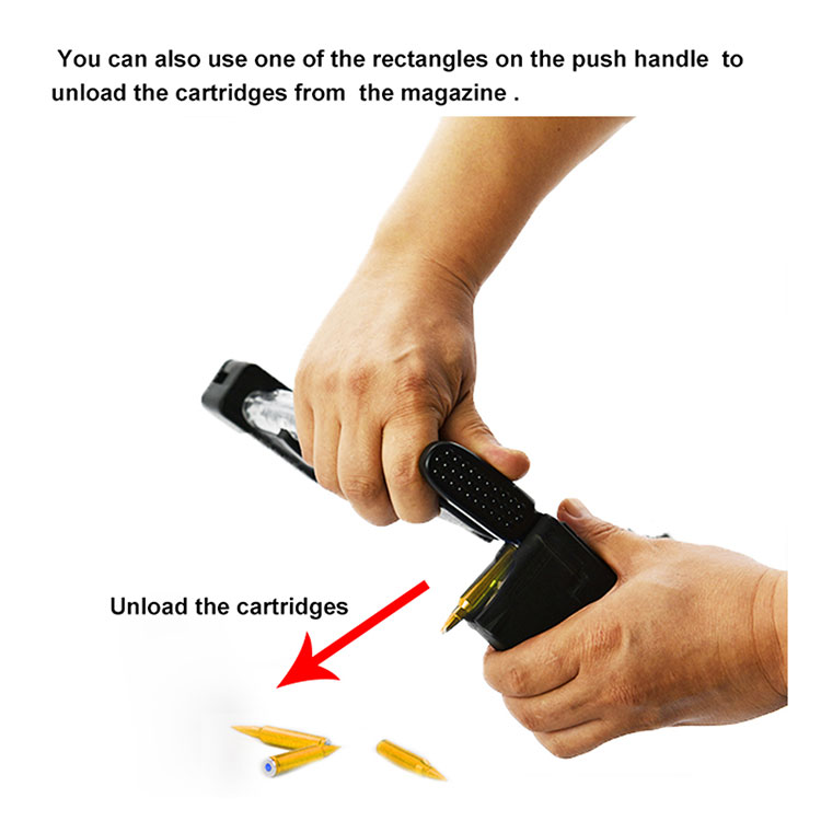 Hitrost nakladanja nabojnika za AR15 ● Uporablja se za polnjenje nabojev 5,56 x 45 mm v nabojnik AR s kapaciteto 10/20/30 ali več. ● Naboje napolnite do konca v utor, namestite nabojnik po enakem mehanskem principu kot AR. potisnite potiskalo, bodo kartuše zlahka vstopile v nabojnik. ● Enostavno upravljanje, dekle lahko naredi zelo hitro. ● Močno telo. Skozi prozoren pokrov lahko vidite kartuše znotraj nakladalnika. Ključavnica nadzoruje, da se pokrov med shranjevanjem ne odpre. ● Prav tako lahko odstrani naboje iz nabojnika, ko ne streljate, a je nabojnik še vedno poln.