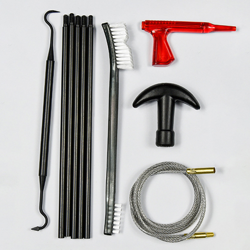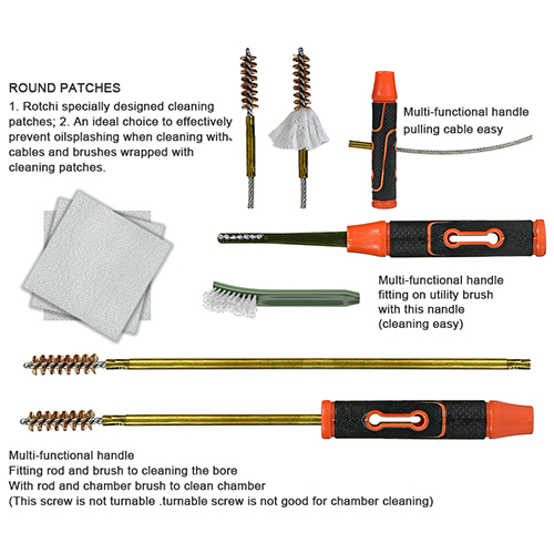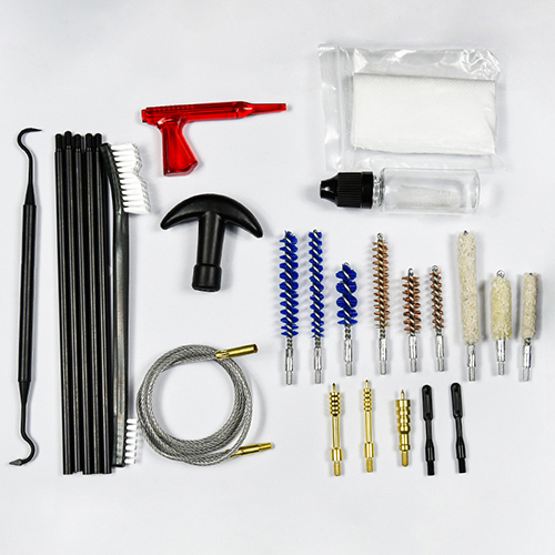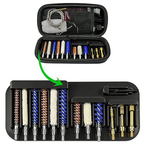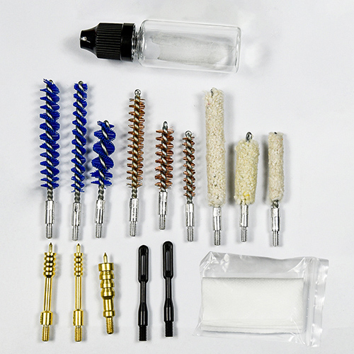 Komplet za čiščenje pušk in pištol vključuje 3 velikosti (.22cal. .30cal. 9mm). OX krpa prevlečena PVC torbica z zadrgo. Medeninaste ščetke, bombažne krpe, najlonske ščetke, medeninaste ščetke, 5 palic 1 calbe. Pesek in črna barva za izbiro.