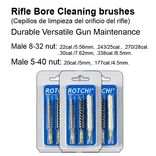 Komplet ščetk za čiščenje cevi 3 v 1, pretisnega omota in kartice. Dobavljive velikosti: .177, .22, .25, .27, .30, .338 kal.